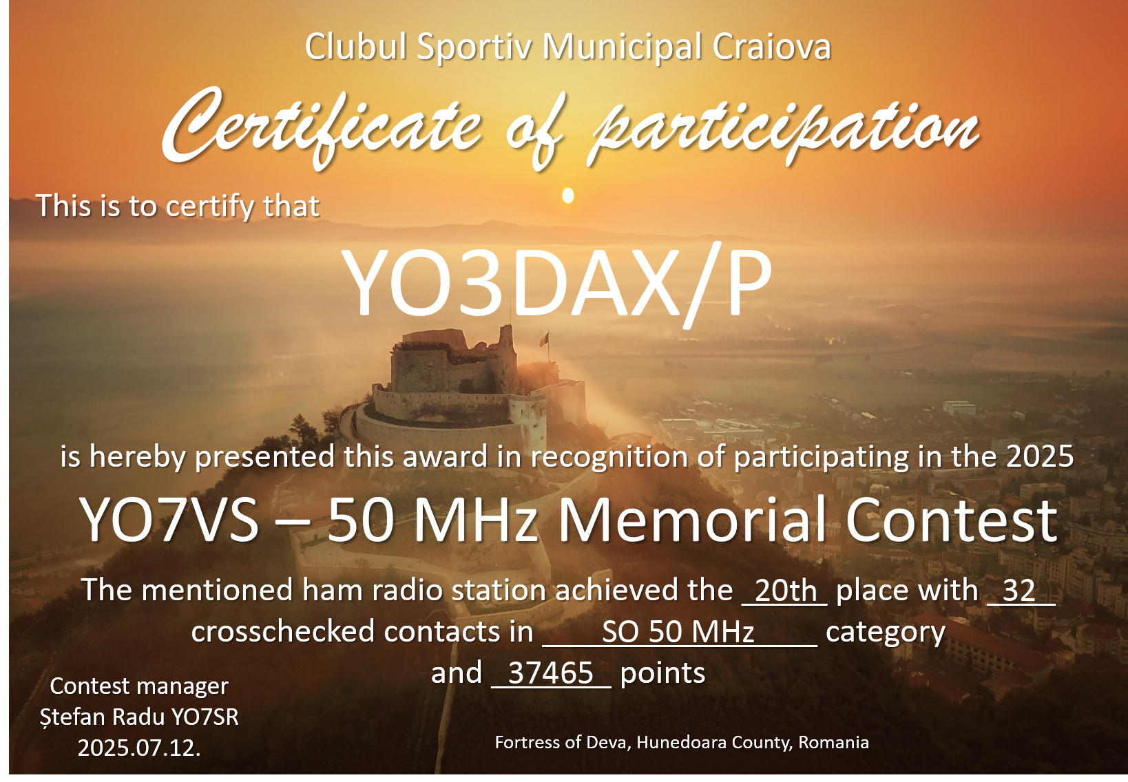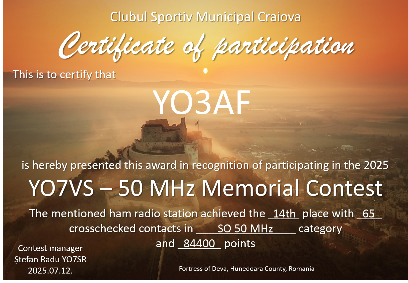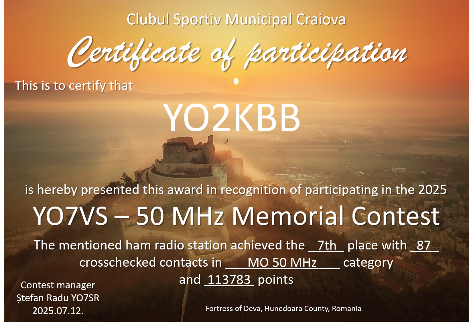 | 12 | YO7LDT | 39 | 3 | 7.1 | 0 | 51782 | 1327.7 | 3 el.YAGI | 100 | GM2T (2299 km) | map | YO7LDT award |