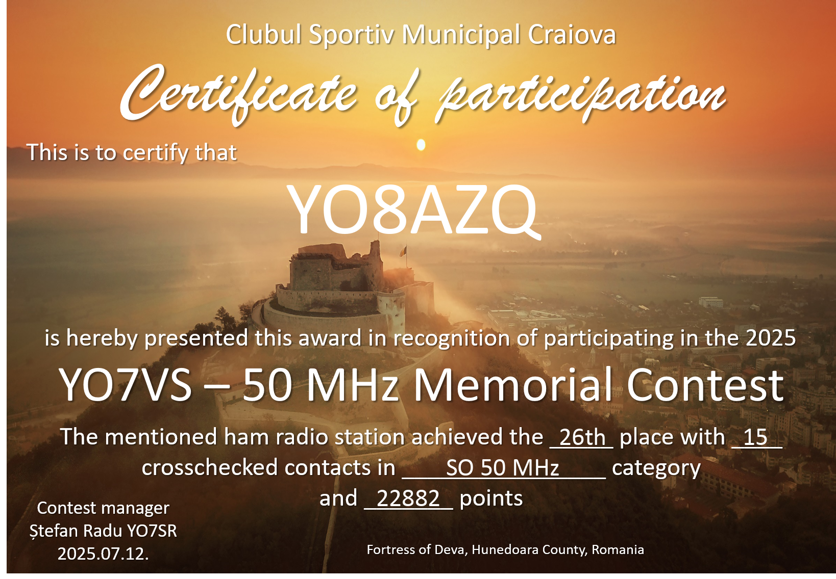 | 24 | YO2MKK | 14 | 4 | 22.2 | 0 | 11063 | 790.2 | yagi4 element | 50 | GM2T (2104 km) | map | YO2MKK award |
